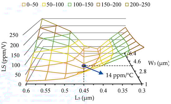 The appropriate length of transistors M2 and M5 (which affect λD2 and λD5) have to be chosen to satisfy Equation (8) in order to mitigate the DIBL effect. Then, (9) can be satisfied by KR1, KR2, and KR3. The minimum length for M2 is chosen to obtain the minimum suitable length of M5. Figure 3 shows the dependence of LS on L5 and W3 for L2 = 0.18 µm. The average of 100 Monte Carlo runs is used for each point. The shown dot has the lowest LS values in this figure. Based on the analysis, the values of L5 = 0.45 µm and W3 = 3.7 µm are chosen for the design.