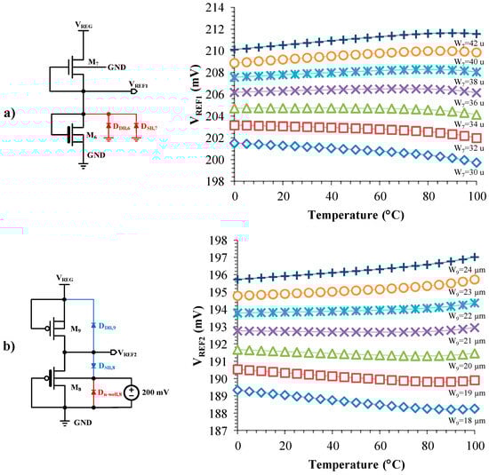 Figure 4a,b illustrate the 2T n-type and p-type reference circuits, respectively. In the 2T n-type reference circuit, the output node contains two parasitic diodes, the reversed biased drain-body of M6, and the source-body of M7. Both diodes draw current from the output node and are shown in red. The reverse saturation currents drawn from the output node result in a concave reference voltage versus temperature curve for the 2T n-type reference (with the substrate connected to the ground) []. This behavior is illustrated in Figure 4a, which shows the simulated temperature dependence of the output voltage for different widths of the current source transistor. The length of both transistors is 2 µm, and the load transistor’s width is 20 µm.