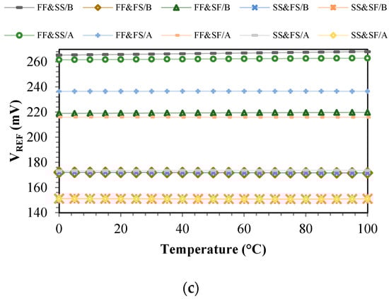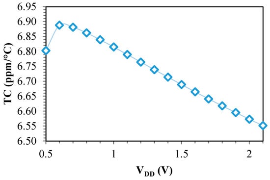 In Equation (22), the aspect ratio for temperature compensation is evaluated. The aspect ratio on the left side of the equation becomes 1.26 using the typical corner technology parameters in (22). This aspect ratio is shifted with the change in the technology parameters in various corners. Therefore, Monte Carlo analysis optimization would be more appropriate than just one corner optimization to reduce the average TC [].