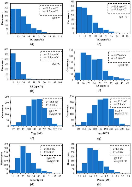 Monte Carlo analysis is used to investigate the effect of process and mismatch variations on TC, LS, power consumption, and the output reference voltage, as shown in Figure 14. In Figure 14a–d, the TC is reported in the temperature range from 0 °C to 100 °C at 0.5 V supply voltage, and the LS is simulated in the 0.5 V to 2.1 V supply voltage range at 25 °C. Power consumption and VREF are also shown at 0.5 V and 25 °C.