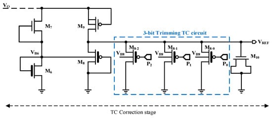 The use of a trimming network can significantly reduce the variations in the reference voltage by modifying the aspect ratio of M8. In [], a suitable scenario for trimming the TC is proposed by removing the extra switches and eliminating variable parasitic diodes. When trimming transistors need to be in the off-state, using a sufficient negative voltage for source-gate transistors minimizes the effects on the output voltage behavior.