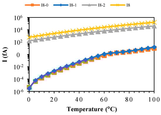 As the trim transistors apply a constant parasitic diode load to the output node independent of their state, this constant load can be compensated with the other parasitic diodes at the output. Given that the output voltage is approximately 0.2 V, the minimum source-gate voltage of the trim transistors while in the off-state is approximately −0.3 V. The currents I8, I8-0, I8-1, and I8-2 in the TT corner are illustrated in Figure 16 when M8-0 and M8-1 are in the off-state.