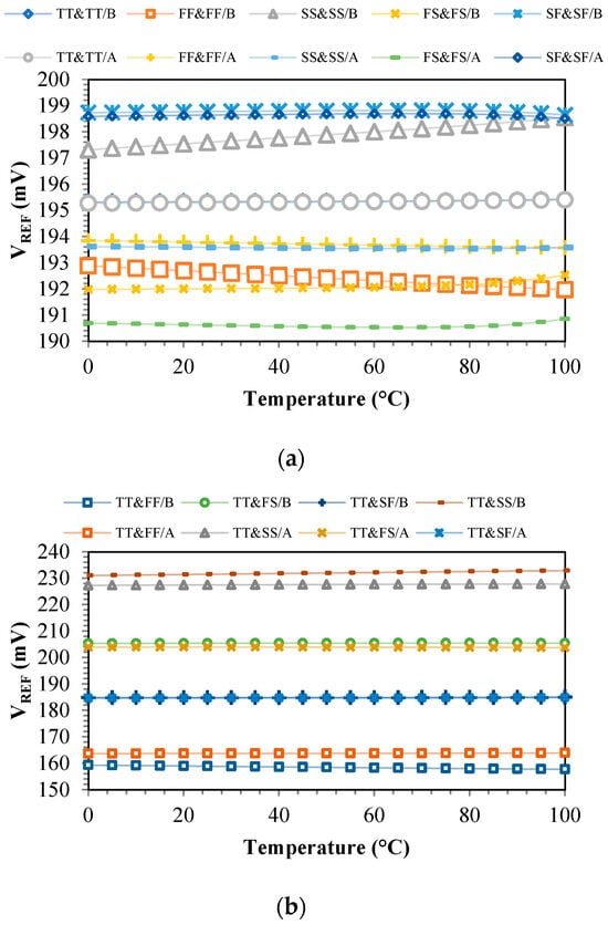VREF,2T_P and VREF,2T_N are 2T p-type and n-type reference voltages, respectively. The output reference voltage changes for VREF,2T_P and VREF,2T_N in temperature compensated form, the reference voltage obtained in (15) (through substituting VREF,2T_N and VREF,2T_P into (15)), and the reference voltage versus temperature changes are simulated in Figure 9. The mean values of VREF obtained from (15), VREF,2T_P, VREF,2T_N, and output VREF are 192.5 mV, 188.8 mV, 207.1 mV, and 195.3 mV, respectively. Assuming ID6 = ID7 and similarly to (13), VB8 is obtained as follows: