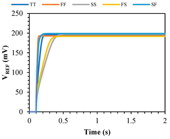 The startup time of the reference voltage at 0 °C and different corners when the minimum supply voltage (VDD = 0.5 V) is turned on at 0.1 s.