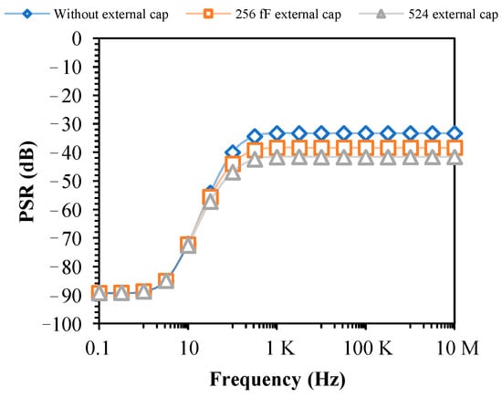 Voltage references are used in analog and digital hybrid systems, so it is necessary to determine their sensitivity to fluctuations in the supply voltage. The M10 transistor is used as a 262 fF capacitor at the output node. At minimum supply voltage and room temperature (25 °C), the PSR from 0.1 Hz to 10 MHz is shown in Figure 19 without an external decoupling capacitor, double the output node capacitance (using an external 262 fF capacitor), and triple the output node capacitance (using an external 524fF capacitance). The PSR near-DC frequencies are very low due to the efficient LS compensation. The minimum PSR is −89.3 dB at 0.1 Hz in all cases, and at high frequencies, it increases due to the leakage capacitors of the transistors and, finally, without external decoupling, remains constant at about −33.3 dB capacitor and, by using the external 262 fF and 524 fF decoupling capacitor, it becomes −38.4 dB and −41.6 dB, respectively.