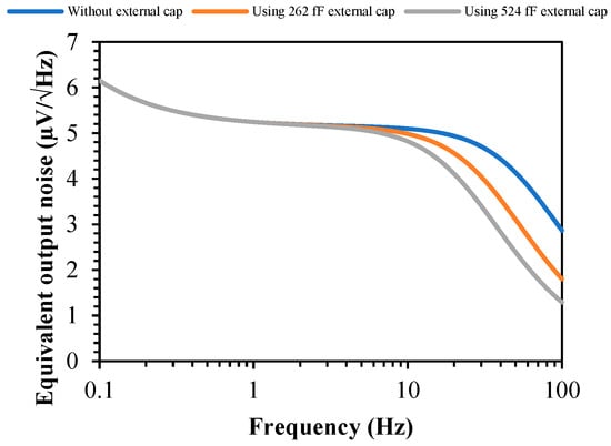 Figure 20 depicts the output noise within the frequency range of 0.1 Hz to 100 Hz, maintaining identical conditions to the PSR. The integrated noise from 0.1 Hz to 10 Hz without additional load capacitors, using the 262 fF external decoupling capacitor and 524 fF, respectively, generates 16.3 µV, 16.2 µV, and 16 µV. In the 0.1 Hz to 100 Hz range, it becomes 41.8 µV, 34.8 µV, and 30.3 µV, respectively. The output noise and PSR can decrease more if the load capacitor increases.