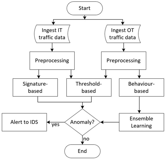 Logical workflow of threat detection approach. IT/OT traffic is ingested and preprocessed to eliminate unwanted or redundant data. Signature-based and threshold-based metrics are not added to an ML model, but sent directly to a rules engine, with normal traffic dropped, and anomalous traffic sent to an IDS for exception alerting. Behaviour-based metrics are fed to a learning model for deeper analysis, with traffic classified as anomalous forwarded to an IDS for exception alerting.