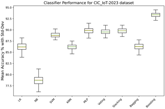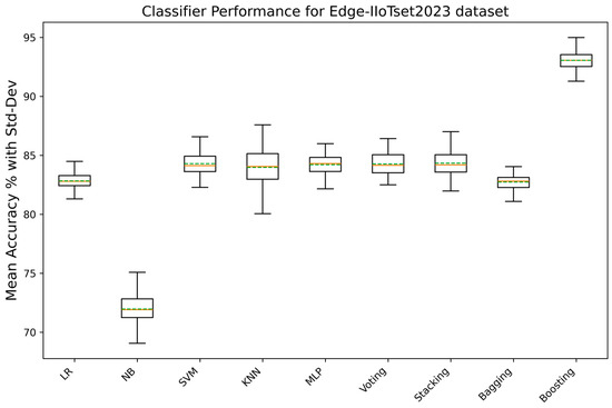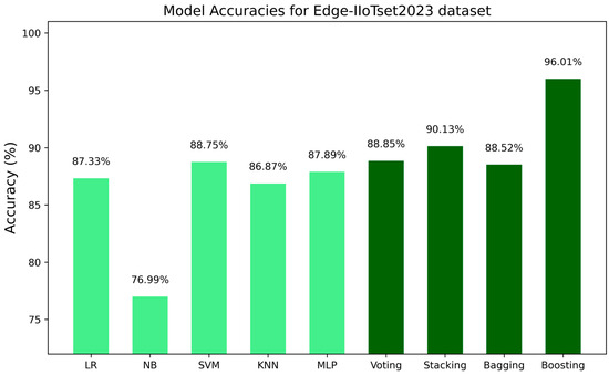 The Boosting ensemble method was the most effective across both datasets, with ~10% improvement in the mean accuracy for the Edge-IIoTset2023 dataset and ~8% improvement in the mean accuracy for the CICIoT2023 dataset. This is to be expected, as the Boosting classifier is designed to train multiple weak learners, and then adjust the weights of the base classifiers to minimize the weaknesses and maximize the strengths, resulting in higher accuracy levels than can be obtained from the base classifiers. The detailed experimental results are shown in Table 3, Table 4, Table 5 and Table 6. The results are visualized in Figure 3, Figure 4, Figure 5 and Figure 6.