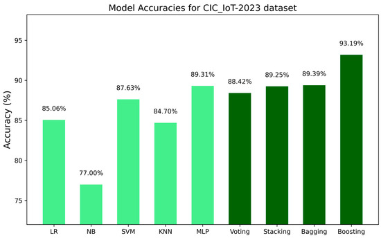Experimental results for CIC_IoT_2023 dataset, showing model accuracy for each base classifier and ensemble model.