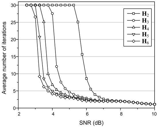 Therefore, we analyze the theoretical number of iterations needed to achieve successful decoding for a range of SNR. The numbers are depicted in Figure 6. Since the graphs look similar to the simulation results shown in Figure 2, the proposed decoding algorithm is consistent with the theoretical analysis. In addition, the existence of an initial partial H-matrix that provides the same error-correcting performance as the full H-matrix for a specific SNR is explained theoretically.