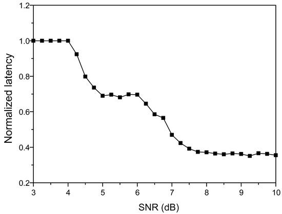 In addition, both the decoding latency and the decoding throughput are enhanced. The normalized latency of the proposed partial decoding algorithm is compared to the conventional one in Figure 4. Since the number of variable nodes connected to each check node is constant, the number of clock cycles taken to process a check node is constant for all partial H-matrices. Therefore, the number of check node operations affects the decoding latency. As the number of check node operations is proportional to the size of the partial H-matrix, the decoding latency can be effectively reduced by reducing the size. In Figure 4, the decoding latency is reduced to 35.5% at maximum compared to the conventional architecture [15]. Since the decoding throughput is inversely proportional to the decoding latency, the proposed partial decoding algorithm can boost the decoding throughput significantly in the beginning stage.