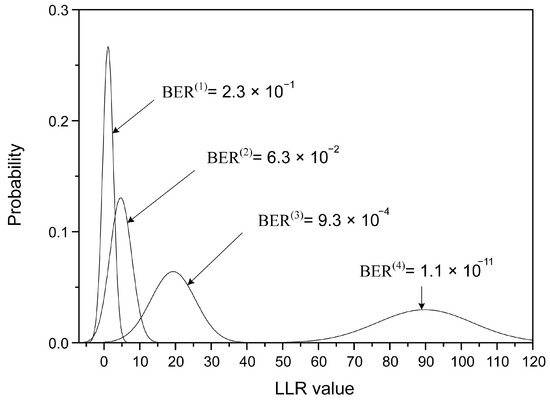 In previous works [16,17], the distribution of for all n is known to be binomially distributed as [16], where represents the Gaussian distribution with mean and variance , and is also binomially distributed [17]. Therefore, the LLR distribution can be obtained by tracking in each iteration. The equations that update variable and check nodes are used to chase the mean of the LLR distribution. In the SPA, the variable node update is expressed as