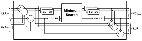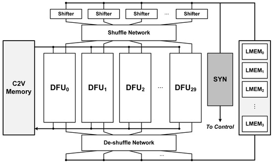 A block diagram of the proposed decoding architecture is shown in Figure 7. Except for the dedicated syndrome checking (SYN) unit, the decoding architecture is identical to the conventional layered min-sum decoder [18]. Each decoding function unit (DFU) performs the independent check node operation in parallel, and the corresponding LLR values and the intermediate C2V values are stored in LMEM and C2V memories, respectively. The detailed architecture of the DFU is shown in Figure 8. Through the shuffle network, the appropriate LLR and C2V values are obtained, followed by number system conversion, addition and subtraction operations. For a fair evaluation of the implementation, the most efficient method among the existing approaches has been applied for the Minimum search logic [19,20].