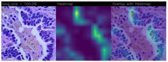 Figure 10. Heatmap related to lung adenocarcinoma, classified as 100% positive. - In the presence of squamous cell carcinoma (Figure 11), the classifier utilises areas with concentrations of dark or irregularly shaped cells as a distinguishing element for this class. This is explained by the fact that squamous cell carcinoma affects the squamous cells of lung tissue.