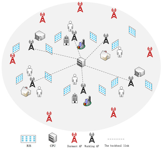 However, in real-world scenarios, the capacity increase achieved by deploying numerous access points (APs) in cell-free (CF) massive MIMO systems comes at the expense of elevated energy consumption [12]. Indu L. Shakya et al. [13] introduced a novel approach called joint AP selection and interference cancellation (JAPSIC) to relocate a multitude of distributed APs closer to mobile users. Jionghui Wang et al. [14] formulated the problem of joint beamforming and AP–user association for millimeter-wave CF massive MIMO systems in the downlink, proposing an algorithm based on alternating average reflection to enhance the performance in terms of the minimum rate and total rate. Nonetheless, these approaches and algorithms offer only limited reductions in energy consumption. To achieve a lower energy consumption, the utilization of reconfigurable intelligent surfaces (RISs) in CF massive MIMO systems presents a promising solution [15]. RISs, comprising numerous passive and cost-effective components, can intelligently adjust the wireless propagation environment. Typically deployed on building exteriors or ceilings, RISs enable non-line-of-sight (NLoS) communication using environment sensing, covering network blind spots while consuming minimal power and conserving resources, thereby enhancing the system capacity [16]. Currently, energy-efficient CF massive MIMO systems have attracted significant research attention. For instance, Y. Zhang et al. [17] proposed a hybrid beamforming system to maximize the energy efficiency (EE) of RIS-assisted CF massive MIMO systems, investigating the influence of transmit power, RIS count, and RIS size on EE. M. Alonzo et al. [18] devised an uplink coordinated transmission strategy leveraging RIS backscattering, considering uplink weighted signal-to-residual ratio (SR) in RIS-assisted CF systems.