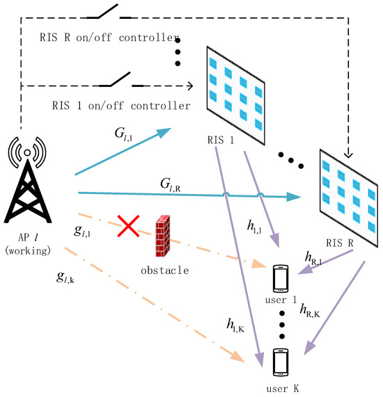 where , , and denote the channel from the lth AP to the kth user, from the rth RIS to the kth user, and from the lth AP to the rth RIS, respectively. In addition, is the additive white Gaussian noise (AWGN) of user k. is the reflection matrix, which can also be called the passive beamformer; it contains the reflection amplitude and the reflection phase formed by reflection elements and is controlled by the RIS deployed near the AP l. can be expressed as follows