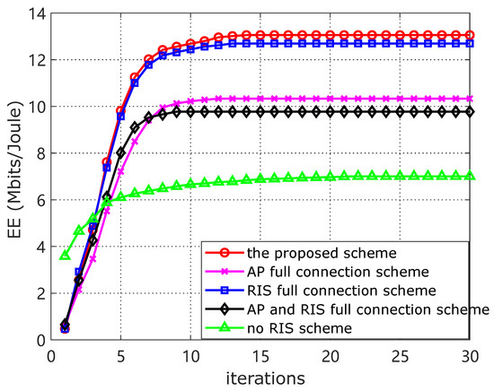 Figure 3 compares the iterative algorithm with the AP fully connected scheme, the RIS fully connected scheme, the AP and RIS fully connected scheme, and the no RIS scheme. The proposed scheme has a higher EE, the values of which were increased by 3%, 26%, 35% and 63% respectively, compared to the other programs. It can be clearly seen that the scheme proposed in this article exhibits a nearly two-fold improvement compared to the RIS-less scheme in terms of EE. The effectiveness of RISs in CF mMIMO systems can be demonstrated when compared to the AP and RIS fully connected scheme. The AP sleep strategy has more impact on the EE of the system than the RIS switching strategy. This verifies the effectiveness of the proposed algorithm in solving the EE of an RIS-assisted CF massive MIMO system.