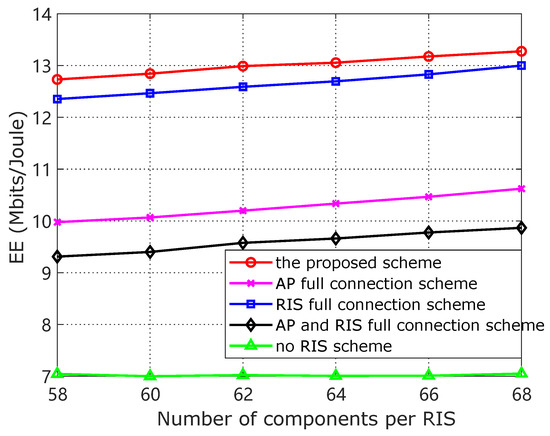 Figure 4 illustrates the EE variation of each scheme when changing the number of RIS elements. Except for the no RIS scheme, when the number of RIS elements is in the range of 58 to 68, the system’s EE increases with the number of RIS elements. First of all, for the no RIS scheme, the change in the number of RIS components does not have any effect on EE. Therefore, there is almost no change in the no RIS scheme. Although RISs require less power consumption and their impact on the EE is lower, the scheme proposed in this article considers the switching of RISs and still has about a 3% improvement in EE compared to the RIS fully connected scheme. It is obvious that the proposed scheme is more energy efficient compared to other schemes.
