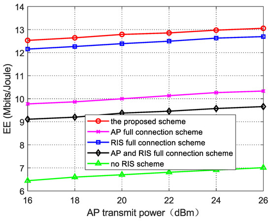 Figure 5 depicts the energy efficiency of each scheme for different AP maximum transmit powers. Overall, the trends in Figure 5 are similar to those in Figure 4. The biggest difference is that the AP transmission power has an effect on the EE value of the no RIS scheme. When the AP transmission power increases, the EE values of all schemes increase essentially linearly. The EE values of the proposed scheme with respect to the no RIS scheme are roughly twice as high as those with respect to the AP and RIS fully connected schemes. The EE increases linearly with the transmit power, which verifies the effectiveness of the proposed scheme.