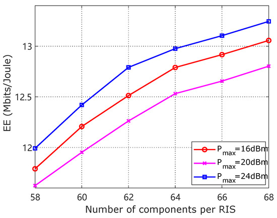 Figure 6 considers the relationship between the number of elements of the RIS and the EE at transmission powers of 16, 20, and 24 dBm, respectively. From the figure, it can be seen that in the proposed scheme, the EE value is proportional to the transmission power and the number of RIS elements. This is due to the low power consumption of RISs and the introduction of additional reflective elements. The increase in the system’s energy consumption is small, which leads to the high energy consumption of the system. This indicates that an RIS with a higher number of deployed elements is more energy efficient.