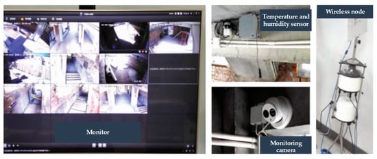 The test environment is equipped with real-time monitoring functions. It includes a total of eleven monitoring cameras, a temperature and humidity sensor, six fixed installation wireless nodes, and six randomly scattered wireless nodes. By utilizing the multi-source wireless environment-sensing network, remote monitoring of testing process and environmental information are achieved, as depicted in Figure 3.