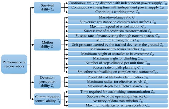 Before constructing the index system, a comprehensive review of evaluation criteria for industrial robots and land mobile robots in the existing literature was conducted. The fundamental performance requirements of industrial robots and land mobile robots encompass robust survival ability to ensure seamless access to rescue sites, versatile motion ability for diverse mission execution, precise detection and perception capabilities to enhance rescue efficiency, and rapid communication abilities for enhanced human–robot collaboration and further improved rescue efficiency [33,34].