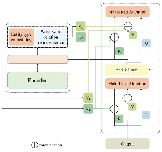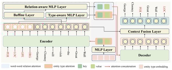 The word–word relation representations reflect the entity boundary information and the syntactic structure of the sentence. These representations are valuable knowledge with which the model can perceive and learn entity boundaries more accurately, which plays a vital role in identifying entities. As the above cannot be directly used in our proposed word–word relation-aware attention mechanism, we feed the representations between words into an MLP layer to obtain useful features. Meanwhile, this process can generate keys and values that match the attention mechanism inherent in the seq2seq model itself. Finally, the obtained word–word relation-aware attention key and value matrices are concatenated with the original key and value , respectively, in the cross-attention layers to enhance the model generation with regard to the entity boundaries. The entity relation-aware attention is defined as follows: