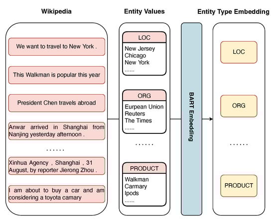The representation of an entity type T is a weighted sum of the entity representations. For example, assuming that the entity label set is , as shown in Figure 2, if entity type contains entity set , the initial embedding of entity type T can be obtained as follows:
