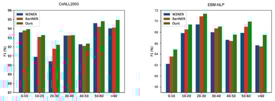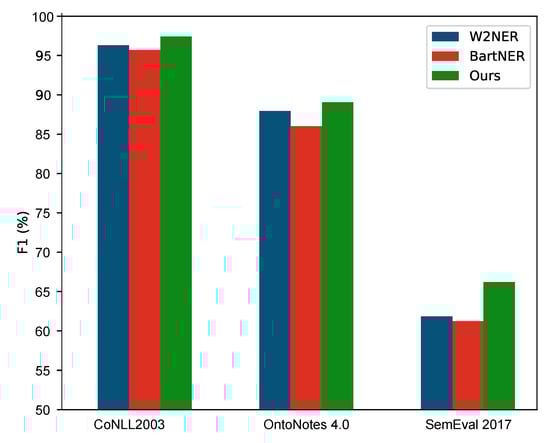 The results on all the datasets are shown in Table 4, Table 5 and Table 6. Several key observations can be made from the comparison results. Our model performs better than some sequence labeling, span-based, and generative models on most datasets. For CoNLL2003, our method outperforms sequence labeling [], the span-based method [], and the hypergraph-based method [] by , and in terms of F1 score. Compared with the seq2seq models (Seq2Seq [], BartNER [], and DebiasNER []), CoNLL 2003 shows increases of , , and . For OntoNotes 5.0, our method improves the F1 score by and compared with the ID-CNNs [] and W2NER [] baselines. Compared with generative models BartNER and DebiasNER, there is an improvement of and , respectively, in terms of the F1 score. For the Chinese NER datasets, all demonstrate improvements in performance to varying extents. Compared to the generative method BartNER, our method shows increases of 5.99%, 0.76%, 2.75%, and 7.68%, respectively. For SemEval 2017 and EBM-NLP, the performance of our method shows significant improvement compared with both BartNER and W2NER. These experimental results validate our hypothesis that our approach can effectively model word–word relations, thereby improving entity decoding. Moreover, the entity type information incorporated into our method further boosts model performance.