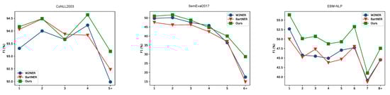 We evaluated NER on CoNLL 2003 [] and OntoNotes 5.0 (https://catalog.ldc.upenn.edu/LDC2013T19 (accessed on 12 November 2023)) [] in English, following the settings splits in prior works [,,]. We performed further testing using OntoNotes 4.0 (https://catalog.ldc.upenn.edu/LDC2011T03 (accessed on 12 November 2023)) [], MSRA [], Weibo [,], and Resume [] in Chinese.