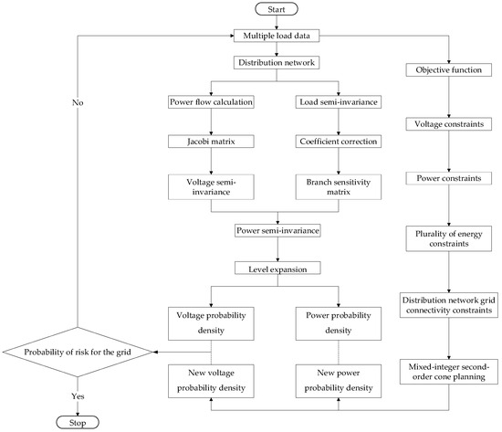 The steps taken in solving the risk prediction model are as follows. Multiple types of load data are imported into the arithmetic example, and the semi-invariants of each order are found based on the probability distribution of the injected power at each node. The probability distribution of the state variables and branch currents is obtained by application of the level expansion equation. Using the original node data regarding the distribution network and related constraints, an improved planning model for the AC power distribution network based on mixed-integer second-order conic planning is established, and the distribution network’s risk value is compared with that of the distribution network before the application of improved planning to determine the distribution network planning scheme.
