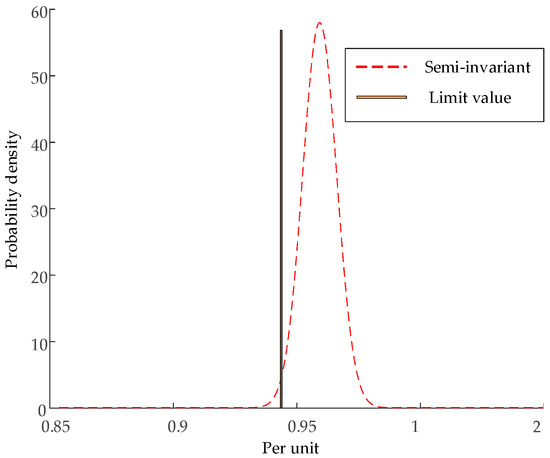 We used Gram–Charlier series expansion to find the distribution network node voltage exceedance and line power exceedance probability density function, as well as the probability distribution function, after calculating the exemplary node voltage exceedance probability, as shown in Table 2. In the distribution network, nodes 13–18 show varying probabilities of their voltage exceeding the lower limit. Nodes 14–16 show a probability of their voltage exceeding the limit by more than 1%, indicating a higher risk level. Nodes 17 and 18 show a probability of the voltage exceeding the limit by more than 10%, indicating a serious risk. In the calculation example, the probability of the power exceeding the limit of the line is shown in Table 3. Lines 6, 22, and 23 are all associated with the possibility of their power exceeding the limit. These probabilities for lines 6 and 22 exceed 1%, indicating a higher risk level. After the application of the method outlined in Section 2.1, the results of voltage testing at the 14th node of the distribution network are shown in Figure 5.