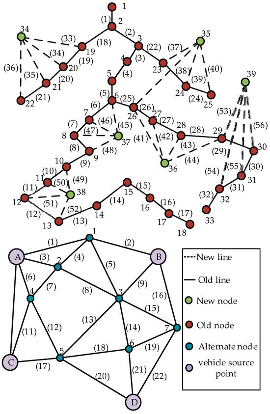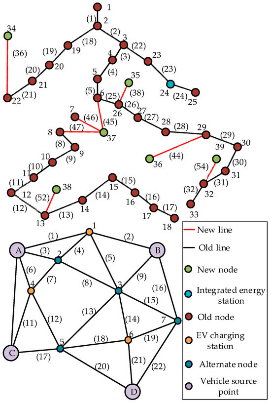 The historical load data were imported into the improved IEEE-33 node, the topology of which is shown in Figure 6; the distribution network contains 39 nodes and 56 branch roads, and the transportation network contains 22 traffic lines. The last six green nodes are new nodes, and the last 24 routes are planned for construction, with a total load of 6.47 MW. The numbers of the nodes planned for connection to wind turbine generators are 12, 19, 23, 35, 36, 37, 38, and 39.