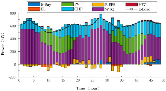 In the 48 h scenario, the integrated energy system meets the load needs by regulating the storage of electrical energy in fuel cells with fewer power purchase credits. The charging and discharging behaviors of the energy storage device are determined based on the photovoltaic generators’ output characteristics. The calculated electric power balance of the integrated energy system in the distribution network is shown in Figure 7.