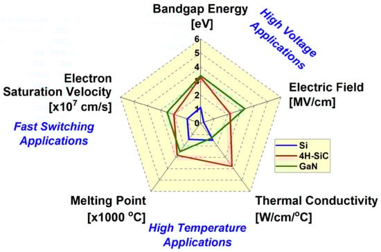 Material characteristic comparison between 4H-SiC, GaN, and Si, reproduced from [1].