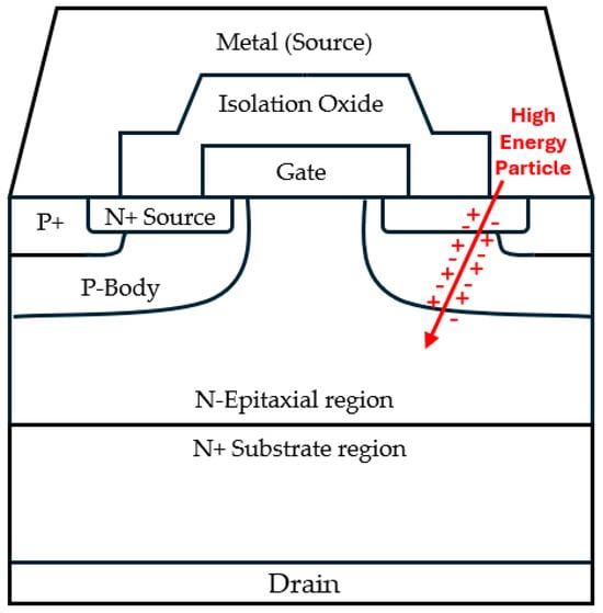 A cross-sectional layout of a generic vertical double-diffused MOSFET (VDMOSFET) is provided in Figure 2. The parasitic BJT structure is inherent to the MOSFET design: the N+ source act as its emitter, the P-body is its base, and the N-epitaxial region as the collector. It was thought the built-in structure could also be activated from radiation-induced currents. Figure 2 depicts a traditional N-channel VDMOSFET under high-energy particle bombardment.
