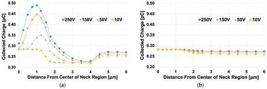 Collected charge simulation results of (a) MOSFETs; (b) diodes with respect to devices lateral position where ion strike occurs, based on the data from [25].