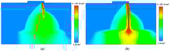 Witulski et al. [8] investigated a SiC MOSFET via 3D TCAD simulation. Their approach was directed at determining the contribution of the BJT turn-on mechanism during burnout. Two MOSFET models were employed: one with nominal impact ionization and one with impact ionization artificially turned off. The results showed that without impact ionization, the device did not experience SEB. The current densities of two models illustrating the difference in impact are redrawn in Figure 6.