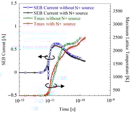 Simulated SEB currents and max lattice temperatures with and without the N+ source region in SiC MOSFET, reproduced from [22].