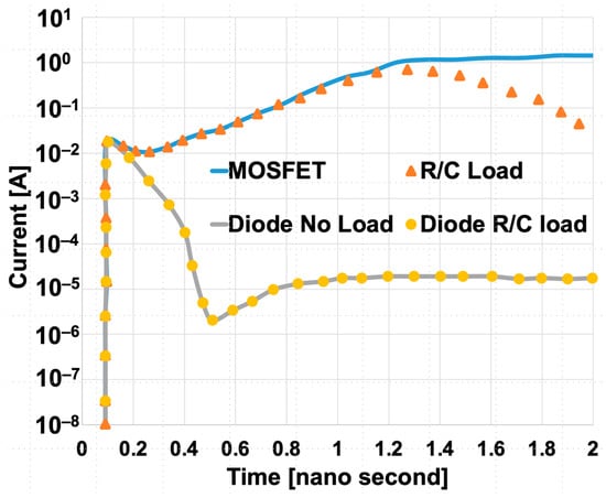 Current plot comparison of diode and MOSFET with and without implementation of the in-line resistor, based on the data from [20]. The diode matches the MOSFET for the first 0.15 ns, then responses begin to differ.