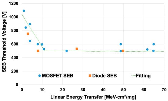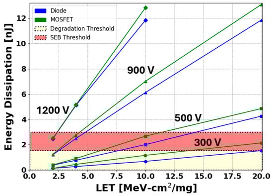 Instead of the parasitic transistor as the primary SEB mechanism, Ball et al. proposed a high-pulse energy failure mechanism. Applying a power density double integral, they stated that the high leakage current generated during ion strike while under high voltage bias results in energy dissipation that can exceed the capabilities of the semiconductor. The mechanism can be summarized in three phases: (1) ion strikes in SiC induce high current transients that occur due to resistive shunts; (2) simultaneous high current and high voltage causes excessive power dissipation; and (3) energy pulses accumulate until the material limits of the device are surpassed, causing various degrees of damage. Figure 10 describes the total energy dissipation required to onset degradation and SEB. The authors suggest a unified energy dissipation threshold as a function of LET and voltage bias. While the energy dissipation threshold has some supported evidence to suggest areas of degradation and SEB, devices have predisposed differences upon fabrication. The threshold values amongst a wide range of devices likely cannot be categorized into SEB/degradation based on one power dissipation calculation using the values from [20] alone.