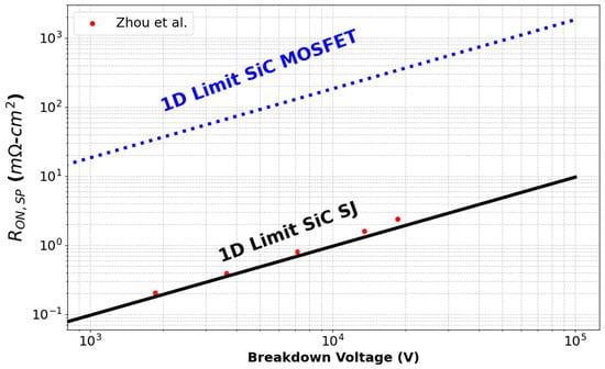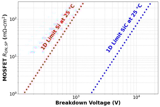 The Ron,sp of a typical commercial 1200 V SiC VDMOSFET is in the range 2–3 mΩ-cm2 [27,65,66,67]. A comparison of the SiC and Si 1D performance limits is made in Figure 12, showing the Ron,sp with respect to the breakdown voltages from analytic data in [65]. A 102 magnitude improvement is illustrated between the materials.