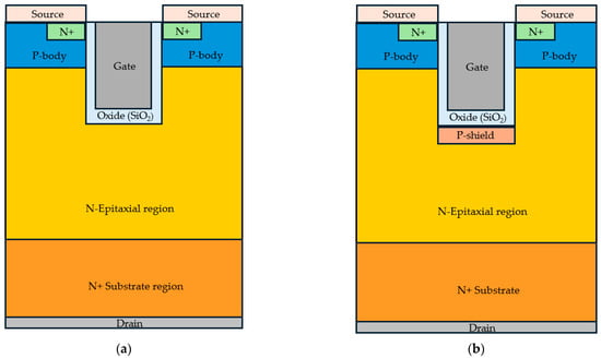 The trench gate or UMOSFET design has been studied as an alternative to the DMOSFET in power electronics because it can reduce the Ron,sp owing to its smaller cell pitch and high channel mobility on the trench sidewall [75,76,80]. The structural differences are illustrated in the cross-section in Figure 13. A parasitic BJT structure exists in this device that is qualitatively the same as a VDMOSFET. Looking at Figure 13a, the N+ source becomes an emitter, the P-body acts as a base, and the N-epitaxial region becomes a drain. Some other common power UMOSFET designs include a “buried” P+ layer underneath the gate oxide to act as a shield (see Figure 13b). This additional layer can reduce peak electric fields at this area when under high voltages to enable optimization, but it trades off with on-resistance [81].