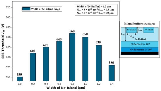 Previously, Wang et al. [92] had proposed island buffer layers in the trench-gate MOSFET. In this 2D simulation work, the initial designs with a breakdown of 1200 V experienced SEB at 450 V. Although Wang et al. deduced SEB by tracking drain current, the maximum global device temperature only reached 492 K within the device at burnout. The temperature dependence of the models employed was not disclosed, though the temperature being underapproximated suggests that it was isothermally modeled. Initial improved designs in this study added two buffer layers, each 1 μm thick, doped at 5 × 1016 cm−3 and 3 × 1017 cm−3, which brought the SEB threshold to 550 V. The most successful SEB design in this work was the island buffer layer redrawn in Figure 14. This design incorporates a heavily doped N+ region within a more lightly doped N-buffer region, which drastically reduces electric field peaks during ion strike. The most optimized design (VBR 1183 V), parameters disclosed in Figure 14, improved the SEB threshold voltage to 660 V (47% improvement).