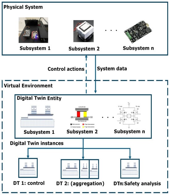 Digital twin conceptual diagram based on [19]. The physical asset domain shares the system’s and subsystems’ data with the virtual environment, where representations of each component are defined on a virtual prototype that can produce instances for different analysis and control tasks.