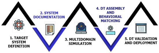 The DT methodological framework proposed by [19,20] shown in Figure 2 can be used to develop a digital twin application. It consists of five steps: target system definition, system documentation, multidomain simulation, DT behavioral matching, and DT evaluation and deployment. In the first step, target system definition, the physical asset is identified and assessed to establish its current status, operation mode, and feasibility for digital twin representation using CAD/CAM tools and physics-based and data-driven models. In the second step, system documentation, all the information related to the system, including existing manuals, blueprints, schematics, P&ID diagrams, datasheets, fault reports, and operation manuals, are collected to provide an in-depth understanding of the physical asset to replicate. Thus, the third step, multidomain simulation, consists of developing a comprehensive simulation model for the DT subsystems’ dynamics based on multiphysics simulators like COMSOL, ANSYS, MSC-ADAMS, Matlab Simscape, among others, or data-driven methods like machine learning or reduced-order models. This model is validated based on the existing knowledge of the system. Once the DT is operative, the fourth step, behavioral matching, is performed, which consists of setting the DT within an optimization algorithm to match its operation with the physical asset using historical datasets, which allows for determination of the correct values of the system’s parameters like frictions, stiffness, thermal capacitance, electrical inductance, sensor noise, among others. An extended discussion on DT behavioral matching for dynamical systems can be found in [25]. Finally, the fifth step, DT implementation and deployment, consists of delivering the model through user interfaces that enable the interaction between the users, the physical asset, and the DT. Depending on the system’s complexity, it can be performed via edge computing with direct asset interaction or a cloud-based service if there are thousands of assets like a drone swarm or a fleet of autonomous vehicles. Each deployment can be used to monitor system faults, and enable awareness capabilities and remaining useful life prediction, among other functionalities.
