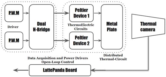 The multivariable temperature uniformity control system shown in Figure 3 is selected as a case study for its digital twin development and adjustment. The system is composed of four critical elements: a FLIR infrared thermal camera (B) and two Peltier thermoelectric modules (A1) and (A2) interconnected by a thin copper plate (A). The control unit is a LattePanda board (C) running Windows 10 and Matlab in a hardware-in-the-loop configuration (HIL) for manipulating Peltier cells and temperature readings from the thermal camera, which is communicated via TCP-IP. The dual power driver (D) controls the heating elements fed from a 12 V battery (E). Table 1 briefly summarizes the critical properties of the power driver, the Peltier modules, the infrared thermal camera, and the copper plate. The datasheet for the system’s components can be found in [26,27,28,29]. A block diagram representation of the multivariable temperature uniformity control system is shown in Figure 4. The dual H-bridge manages the system’s energy consumption via a PWM generator for each Peltier cell. Thus, the thermoelectric circuit of each Peltier device is connected to the thermal distributed circuit corresponding to the metal plate, whose temperature is read by the thermal camera and sent to the LattePanda Board for data acquisition.