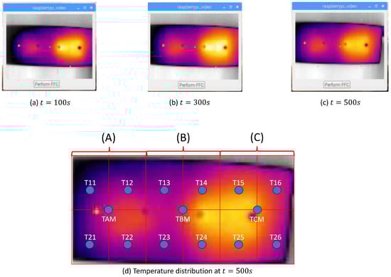 Uniformity temperature distribution acquired using the infrared thermal camera for the Peltier multivariable system. As can be observed, the copper plate heating process is performed for (a) 100 s, (b) 300 s, and (c) 500 s. The temperature measurements are distributed in three zones A, B, C divided as 2 × 6 grid as shown in (d), where the temperature where each partition is performed is the average temperature including the central tap measurements .
