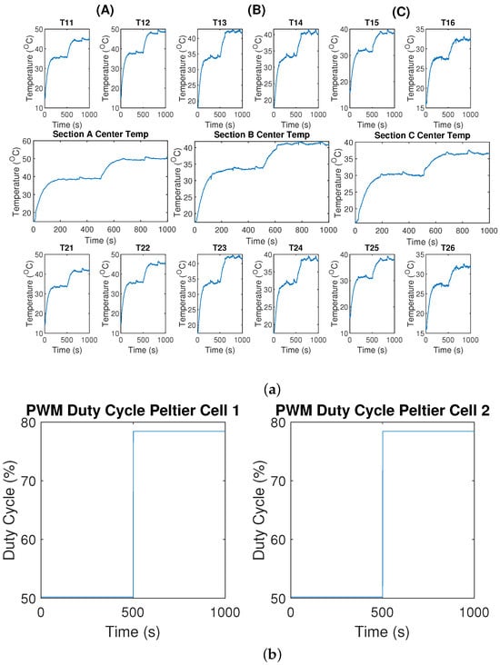 The temperature uniformity distribution response of the system is shown in Figure 5 for different time instants: (a) 100 s, (b) 300 s, and (c) 500 s when a 50% duty cycle is applied to each cell. As can be observed, the dual Peltier cells heat the thermal plate, and it is noted that one of the cells has a stronger thermal interaction with the plate. This is caused by the mechanical attachment between the Peltier element and the copper plate, which is loose, producing a smaller thermal interaction. Likewise, notice that the infrared camera resolution of pixels can provide a maximum of 4800 pixels with temperature measurements. Although this great feature provides superior sensing capabilities, it can make the digital twin computationally expensive for its evaluation and behavioral matching. For this reason, the thermal plate is divided into 12 heating zones and 3 central taps, as shown in Figure 5d for 15 temperature measurements. The first 12 correspond to the average temperature at each heating zone or . The remaining parameters correspond to the center taps , and for the zones (A), (B), and (C), which provide information regarding the plate and Peltier heaters’ interaction. The temperature response of each thermal zone to for 50% and 75% duty cycle inputs applied to the Peltier cells is shown in Figure 6. It can be observed that there is a difference in the maximum and minimum temperatures as shown in the thermal image.