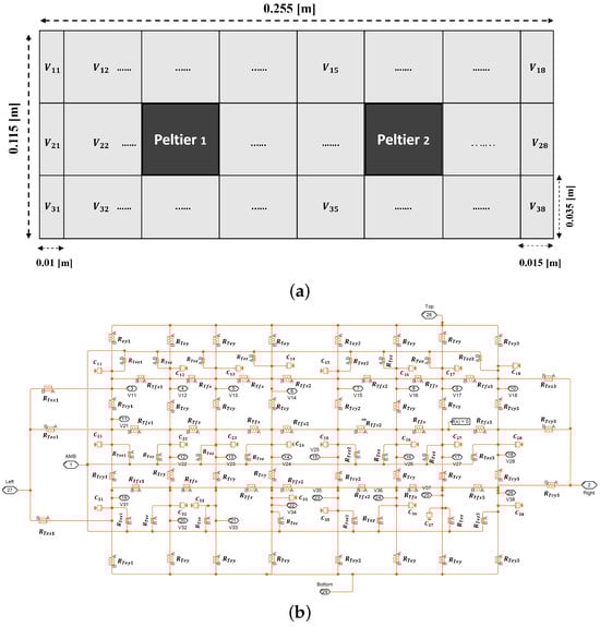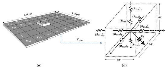 Thermal distributed element circuit: (a) copper plate volume elements’ spatial distribution where the Peltier heating device is fixed to one element and (b) the discrete thermal circuit for a single volume element.